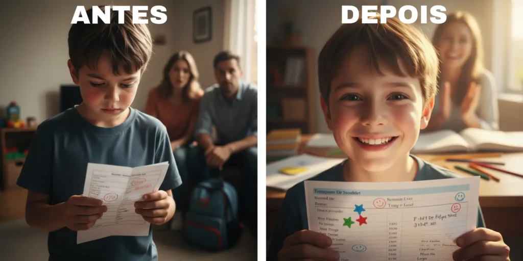 Fazer em dupla acalma o sistema nervoso da criança e cria um ambiente seguro para ela tentar, errar e tentar de novo. Isso constrói confiança — e confiança é combustível para concentração.