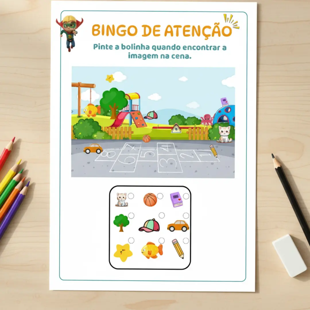 ❌ Atividades pedagógicas tradicionais: Focam no conteúdo (letras, números), mas não treinam o cérebro a SE CONCENTRAR.