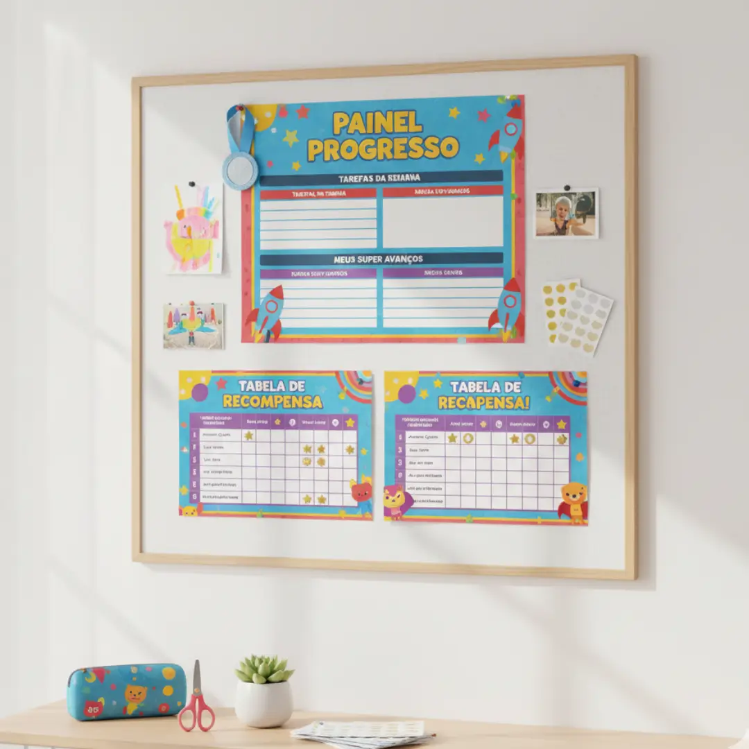 Além disso, o kit já inclui materiais prontos para imprimir: 15 jogos de memória, 10 quebra-cabeças, timers visuais, tabelas de recompensa e certificados.